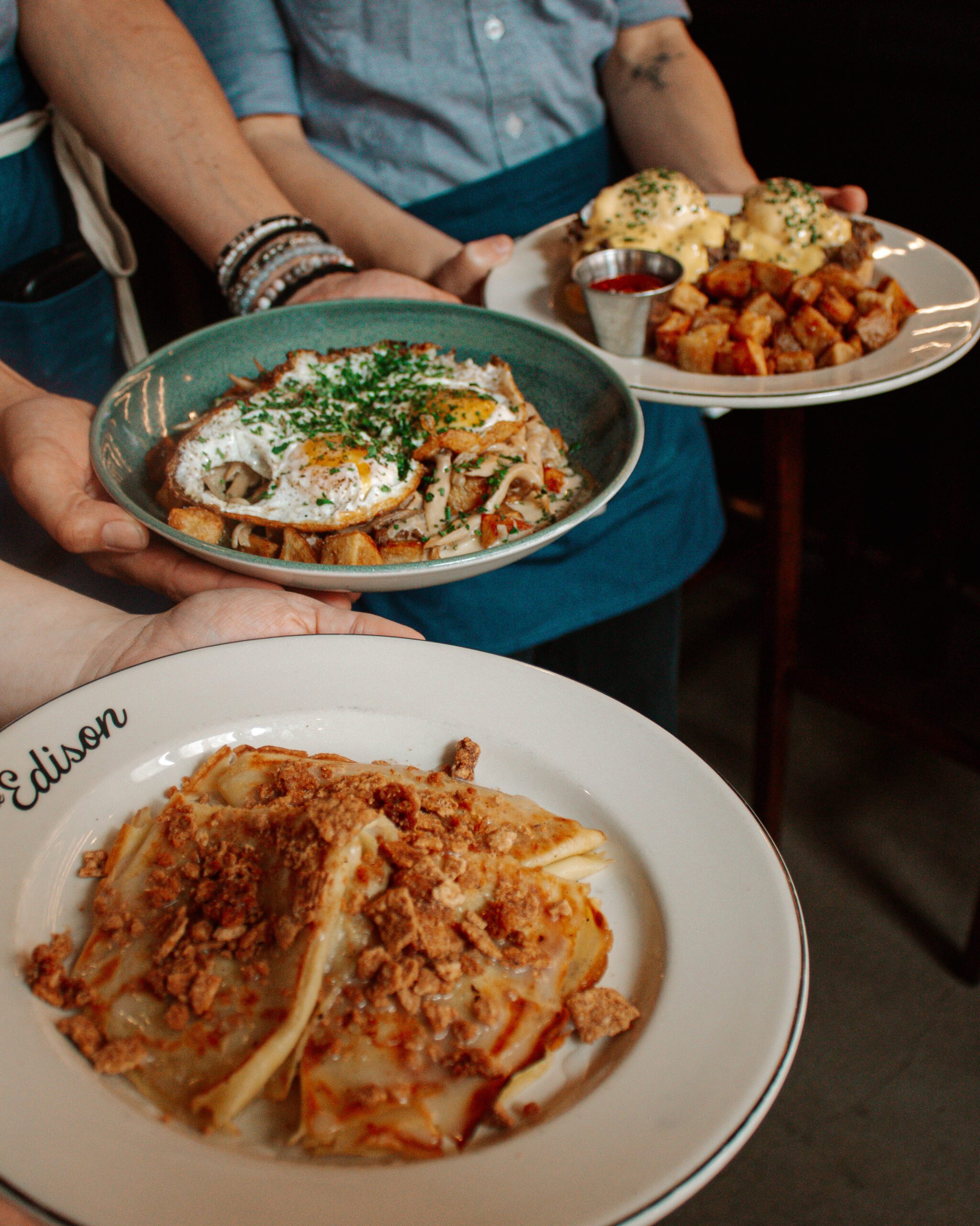 Shaved ribeye, caramelized onion, poached eggs, cheesy hollandaise, ciabatta